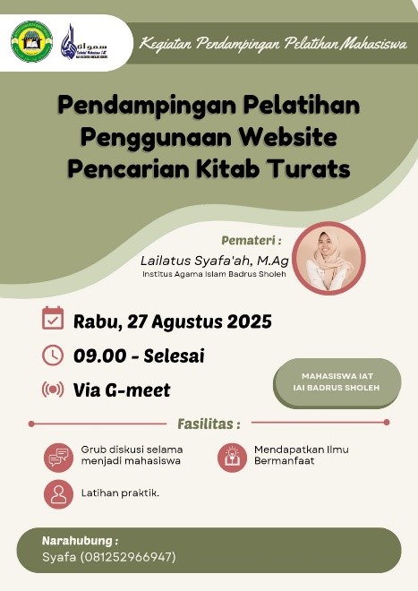 Kediri, 27 Agustus 2025, Institut Agama Islam Badrus Sholeh (IAI-BA) kembali mengadakan kegiatan akademik yang berorientasi pada peningkatan literasi digital mahasiswa. Program Studi Ilmu al-Qur’an dan Tafsir menggelar Pelatihan Pencarian Kitab Turats secara berani melalui platform Google Meet. Kegiatan ini ditujukan bagi mahasiswa Prodi Ilmu al-Qur’an dan Tafsir dengan tujuan utama membekali peserta kemampuan dalam...Read More